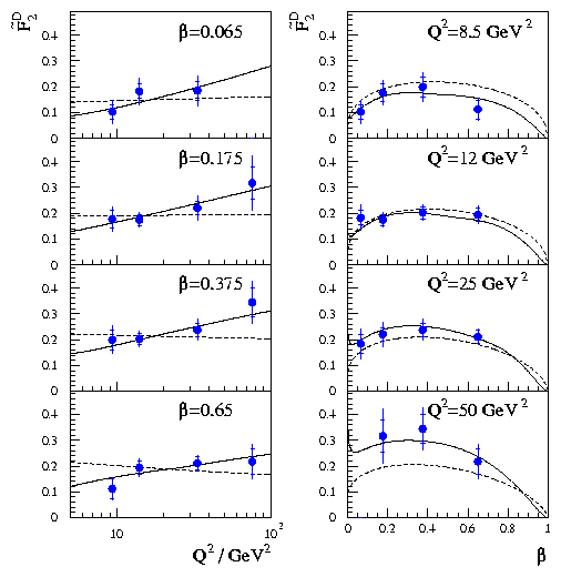 The overall cross sections in each b, Q2 interval are similar and one can integrate over the measured xIP dependence in order to determine [F\tilde]2D(b, Q2), a quantity which measures the internal structure of the pomeron up to an arbitrary integration constant. Presented in this integrated form, the data agree on the general features of the internal structure. In Figure 8 the H1 data are compared to preliminary QCD fits [31]. The general conclusions from the b dependence are that the pomeron has a predominantly hard structure, typically characterised by a symmetric b(1-b) dependence, but also containing an additional, significant contribution at low b which has been fitted in the ZEUS analysis [24]. The virtual photon only couples directly to quarks, but the overall cross section can give indications only of the relative proportion of quarks and gluons within the pomeron, since the flux normalisation is somewhat arbitrary [24]. The Q2 behaviour is broadly scaling, consistent with a partonic structure of the pomeron. Probing more deeply, however, a characteristic logarithmic rise of [F\tilde]2D is observed in all b intervals. Most significantly, at large b a predominantly quark-like object would radiate gluons resulting in negative scaling violations as in the case of the large-x ( >~ 0.15) behaviour of the proton. The question of whether the pomeron is predominantly quarks or gluons, corresponding to a ``quarkball" or a ``gluemoron" [32], has been tested quantitatively by H1 using QCD fits to [F\tilde]2D [31]. A flavour singlet quark density input of the form zq(z) = Aq ·zBq(1-z)Cq, where z is the momentum fraction carried by the quark, yields a numerically acceptable c2. The characteristic Q2 behaviour, however, is not reproduced. Adding a gluon contribution of similar form gives an excellent description of the data. The fit shown uses Bq = 0.35, Cq = 0.35, Bg = 8, Cg = 0.3. In general, the fits tend to favour inputs where the gluon carries a significant fraction, ~ 70 to 90%, of the pomeron's momentum.