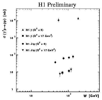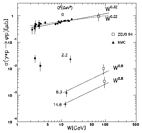 Finally, first results based on the observation of 42 J/y events at significant <Q2> = 17.7 GeV2 have been reported by H1 [13]. The cross section has been evaluated in two W intervals in order to obtain an indication of the W dependence, as shown in Figure 5, where an estimated 50% contribution due to double dissociation has been subtracted [22]. The electroproduction data are shown with statistical errors only although the systematics are estimated to be smaller than these errors ( @ 20%). The electroproduction and photoproduction J/y data are consistent with the W0.8 dependence ([`(e)] @ 0.2) noted previously. The J/y electroproduction cross section is of the same order of that of the r0 data, in marked contrast to the significantly lower photoproduction cross section for the J/y, even at HERA energies, also shown in Figure 5. Further results in this area would allow tests of the underlying dynamics for transverse and longitudinally polarised photons coupling to light and heavy quarks in the pQCD calculations.