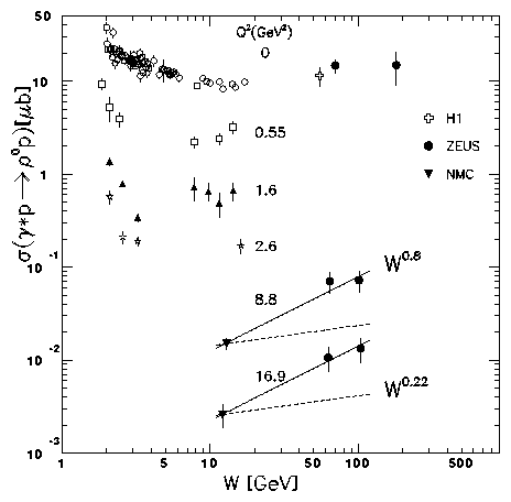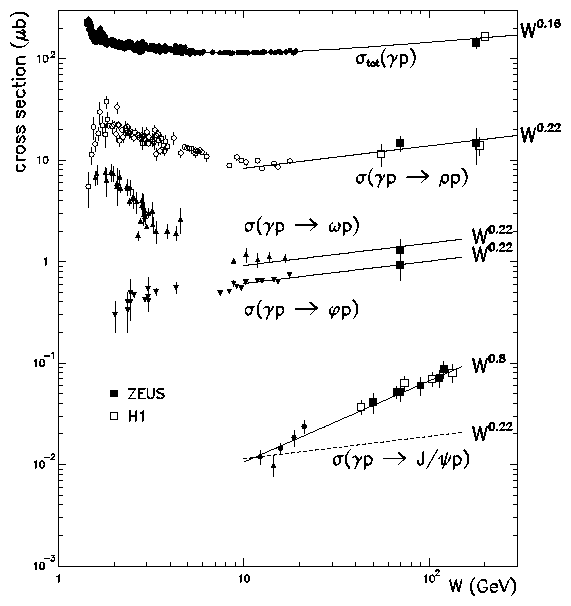 Integrating over the measured t dependence, the W dependence of the results on exclusive vector meson photoproduction cross sections are shown in Figure 3 [18]. From the experimental perspective, there is generally good agreement on the measured cross sections. The gp total cross section is also shown in Figure 3, rising with increasing energy as in hadron-hadron collisions and consistent with a value of e @ 0.08 i.e. the total cross section increases as W0.16.
