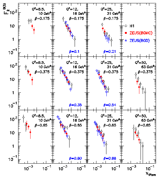 The virtual-photon proton cross sections measured at fixed M2 and W, measured in this analysis, can be converted to F2D(3) at fixed b and xIP. These results are shown in Figure 7 as the ZEUS(BGD) [27] analysis, compared to the earlier H1 [23] and ZEUS(BGMC) [24] analyses in comparable intervals of b and Q2 as a function of xIP. The overall cross sections in each b and Q2 interval are similar, however, the xIP dependences are different. As can be seen in Figure 6, the background estimates are significantly different which results in a systematic shift in the W (xIP) dependence at fixed M (b) and Q2.