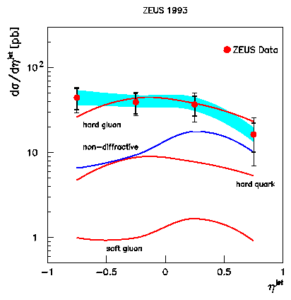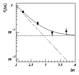 So far we have only considered the case of small-t diffraction with respect to the outgoing proton. Further insight into the diffractive exchange process can be obtained by measurements of the rapidity gap between jets. Here, a class of events is observed with little hadronic activity between the jets [35]. The jets have ETjet > 6 GeV and are separated by a pseudorapidity interval (Dh) of up to 4 units. The scale of the momentum transfer, t, is not precisely defined but is of order (ETjet)2. A gap is defined as the absence of particles with transverse energy greater than 300 MeV between the jets. The fraction of events containing a gap is then measured as a function of Dh, as shown in Figure 10. The fit indicates the sum of an exponential behaviour, as expected for non-diffractive processes and discussed in relation to the diffractive DIS data, and a flat distribution expected for diffractive processes. At values of Dh >~ 3, an excess is seen with a constant fraction over the expectation for non-diffractive exchange at @ 0.07±0.03. This can be interpreted as evidence for large-t diffractive scattering. In fact, secondary interactions of the photon and proton remnant jets could fill in the gap and therefore the underlying process could play a more significant rôle. The size of this fraction is relatively large when compared to a similar analysis by D0 and CDF where a constant fraction at @ 0.01 is observed [36,37]. The relative probability may differ due to the higher W values of the Tevatron compared to HERA or, perhaps, due to differences in the underlying gp and p[`p] interactions.