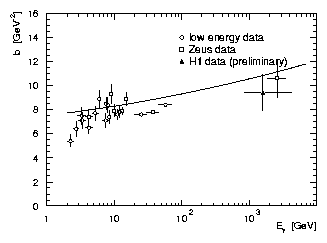 Photoproduction processes have been extensively studied in fixed-target experiments, providing a large range in W over which to study the cross sections. The key features are the weak dependence of the cross section on W, an exponential dependence on t with a slope which shrinks with increasing W and the retention of the helicity of the photon by the vector meson. The t dependence of the r0 photoproduction data is illustrated in Figure 2 where the H1 and ZEUS data are compared to a compilation of lower energy data [16]. The data are consistent with a shrinkage of the t slope with increasing Eg @ W2/2 , where Eg is the photon energy in the proton rest frame, as indicated by the curve for soft pomeron exchange [17].