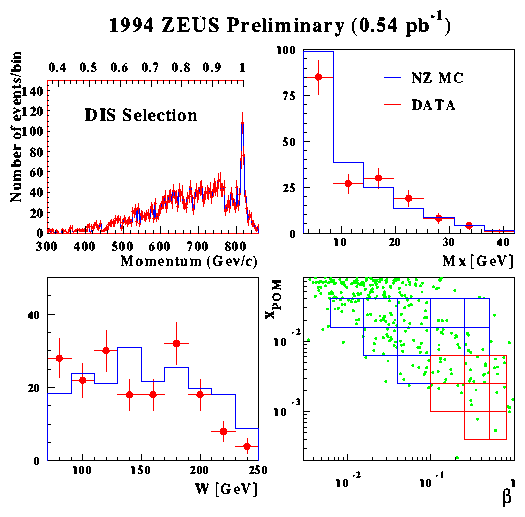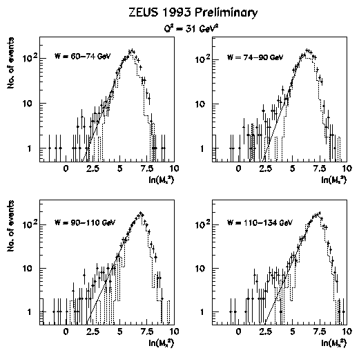 As discussed above, a major uncertainty comes from the estimation of the non-diffractive background. This problem has been addressed in a different way in a further analysis by ZEUS [27]. In this analysis the mass spectrum, M2, is measured as a function of W and Q2, as shown in Figure 6 for four representative intervals, where the measured mass is reconstructed in the calorimeter and corrected for energy loss but not for detector acceptance, resulting in the turnover at large M2. The diffractive data are observed as a low mass shoulder at low W, which becomes increasingly apparent at higher W. Also shown in the figure are the estimates of the non-diffractive background based on (a) the ARIADNE Monte Carlo (dotted histogram) and (b) a direct fit to the data, discussed below.
