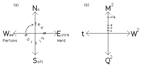 Whilst these Regge-based models give a unified description of all pre-HERA diffractive data, this approach is not fundamentally linked to the underlying theory of QCD. It has been anticipated that at HERA energies if either of the scales Q2, M2 or t become larger than the QCD scale L2, then it may be possible to apply perturbative QCD (pQCD) techniques, which predict changes to this power law behaviour, corresponding to an increase in the effective value of e and a decrease of a'. This brings us from the regime of dominance of the slowly-rising ``soft" pomeron to the newly emergent ``hard" behaviour and the question of how a transition may occur between the two. Precisely where the Regge-based approach breaks down or where pQCD may be applicable is open to experimental question. The emphasis is therefore on the internal (in)consistency of a wide range of measurements of diffractive and total cross sections. As an experimentalist navigating around the various theoretical concepts of the pomeron, it is sometimes difficult to see which direction to take and what transitions occur where (Figure 1(a)). However, from an experimental perspective, the directions are clear, even if the map is far from complete (Figure 1(b)).