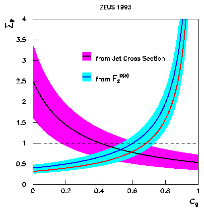 We now have two sets of data, the DIS data [24] probing the pomeron structure at a scale Q and the jet data probing at a scale of ETjet. Each probes the large z structure of the pomeron with the jet and DIS data, predominantly sampling the (hard) gluon and quark distributions, respectively. In Figure 9(b) the preferred momentum fraction carried by the (hard) gluon, cg, is indicated by the overlapping region of the jet (dark band) and DIS (light band) fits to the data. Considering the systematics due to the non-diffractive background, modelled using the Monte Carlo models, a range of values consistent with cg ~ 0.55 ±0.25 can be estimated. The result depends on the assumption that the cross sections for both sets of data factorise with a universal flux, characterised by the same value of [`(e)] in this W range, but does not assume the momentum sum rule.
