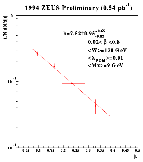The measured t slopes are 9.4±1.4±0.7 GeV-2 (H1) [5] and 10.4±0.6±1.1 GeV-2 (ZEUS) [6] for the r0 (where similar single-exponential fits have been applied). These values can be compared to 7.3±1.0±0.8 GeV-2 (ZEUS) [9] for the f and 4.7±1.9 GeV-2 (H1) [11] for the J/y. Physically, the slope of the t dependence in diffractive interactions tells us about the effective radius of that interaction, R: if ds/dt µ e-b|t|, then b @ 1/4 R2. The range of measured b slopes varies from around 4 GeV-2 (R @ 0.8 fm) to 10 GeV-2 (R @ 1.3 fm). Further, the interaction radius can be approximately related to the radii of the interacting proton and vector meson, R @ [Ö(RP2 + RV2)]. Given RP @ 0.7 fm, then this variation in b slopes corresponds to a significant change in the effective radius of the interacting vector meson from RV @ 0.4 fm to RV @ 1.1 fm.